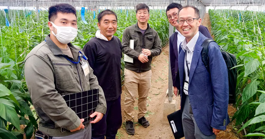 JA高知県での商談に続いて、久保チーフのご案内で安芸営農経済センターの芸西集出荷場を訪問しました。上田場長、倉澤様、小松様と商談を行い、ピーマン栽培の現場を視察しました。