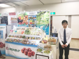 カット野菜部 次長の寺田、課長の瀬田 をはじめとして7名の頼もしいメンバーで弊社工場で加工している加工・業務用野菜や色とりどりのコンシューマサラダパック、そしてクラカグループの県産野菜を使用したドレッシングをそれぞれで展示し、全国の食品関係業者様向けにPRしおります。